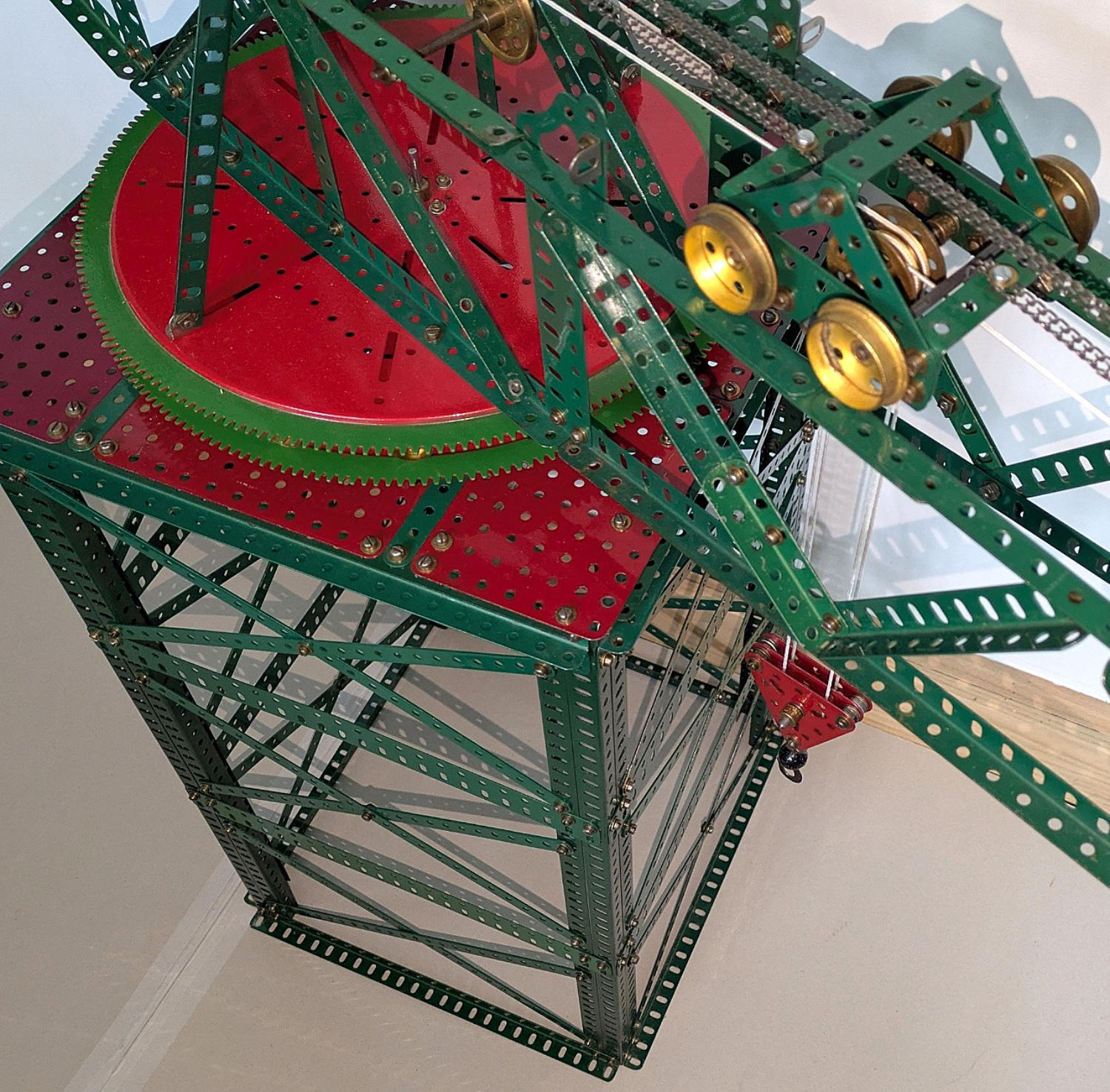 Click on the images to see larger pictures.I have built several Hammer-head cranes but this is the first time I have built this "classic" Super Model SML 29. The instructions for this crane were originally published in the December 1925 Meccano Magazine and were re-published in 1930 as SML 29 as part of the Super Model Leaflet series. In 1934 the leaflet was revised and was shown in the new blue/gold colour scheme and included the Geared Roller Bearing the crane and was shown as an "L" set model. The "L" set did not in fact include the GRB or sufficient P/N 7 24.5" girders. The original 1930 instructions had used a built up roller bearing from 16 channel segments although it was pointed out that “readers who have the new p/n 167 Geared Roller Bearing this can be used in place of the arrangement shown.” You may wonder why it was not shown in the 1930 instructions? The reason was Meccano had just lifted the instructions straight from the 1925 Meccano Magazine and this per-dated the introduction of the GRB and did not bother to make major changes other than text to the 1930 leaflet. The cover of the 1934 leaflet is shown above left.I have built the model using parts from my circa 1930 No. 7 red and green set plus a modern reproduction GRB. I followed the second 1934 version plans with few changes, the only major one being the substitution of cross bracing strips with girders on the boom. The reason was to make the boom less flimsy and more rigid. The crane is powered by a E20B motor. To operate the crane, gears for each function must first be engaged and then the E20B motor switched on. The crane can be slewed, the crab or trolley can transverse the boom and the hoist pulley block can be lowered or lifted. The hoist has a weighted cord brake that does work with a moderate load.The prototypes of this type of crane were built between the 1900s - 1950s and can still seen be at naval dockyards and ship builders around the world. Although referred to as "Hammer Head Cranes" the more correct term should be a "Giant Cantilever Crane". There are or were fine examples on Clydeside, Cowes, Halifax Nova Scotia and Sydney Australia. They were designed to be used for very heavy lifting during the fittingly out and repair of large ships. Many of the cranes were capable of lifts of over 250 tonnes. Their use was some what restricted as they were built in a fixed position on the dock side.