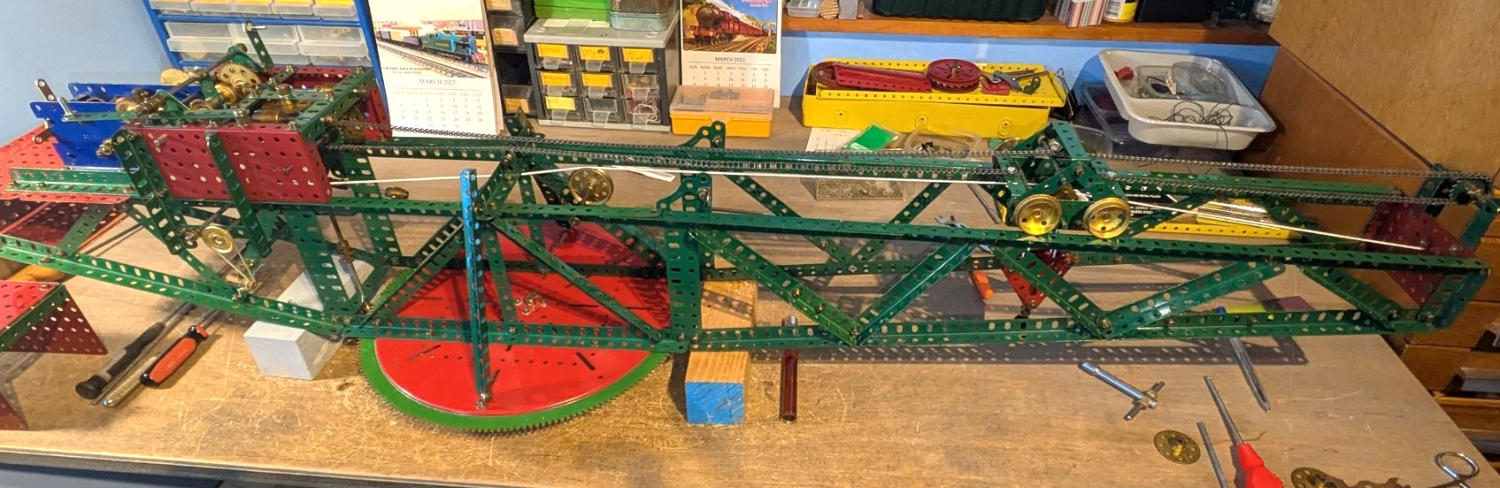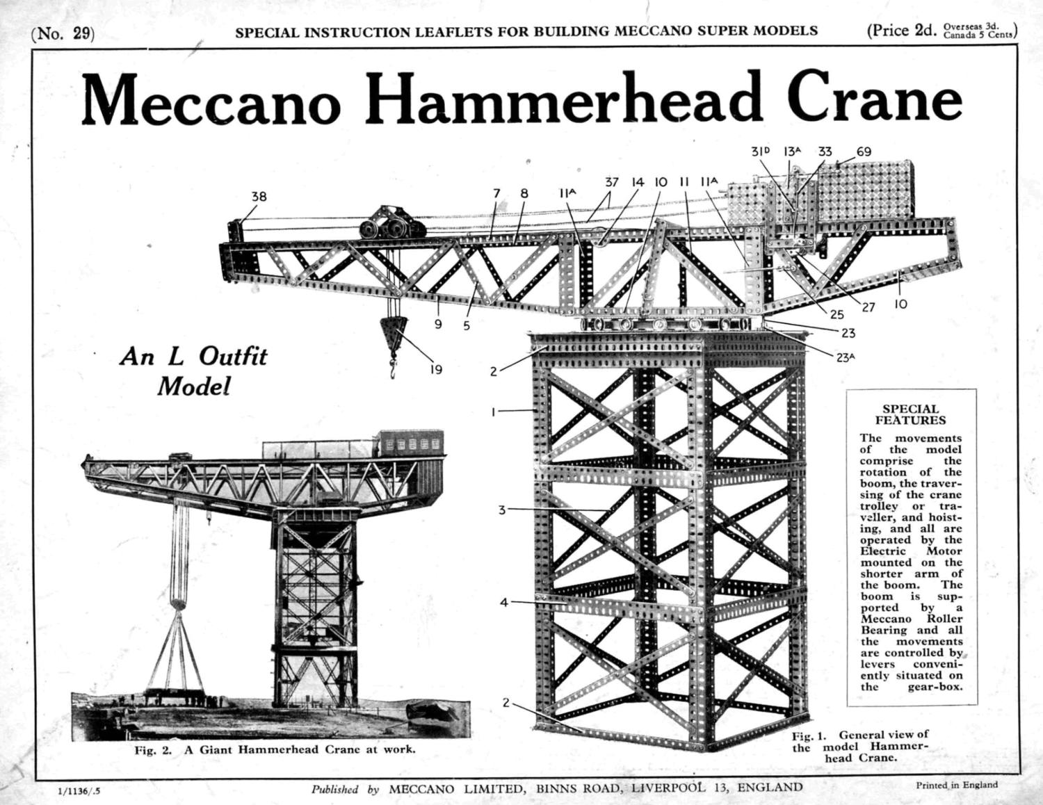 Click on the images to see larger pictures.I have built several Hammer-head cranes but this is the first time I have built this "classic" Super Model SML 29. The instructions for this crane were originally published in the December 1925 Meccano Magazine and were re-published in 1930 as SML 29 as part of the Super Model Leaflet series. In 1934 the leaflet was revised and was shown in the new blue/gold colour scheme and included the Geared Roller Bearing the crane and was shown as an "L" set model. The "L" set did not in fact include the GRB or sufficient P/N 7 24.5" girders. The original 1930 instructions had used a built up roller bearing from 16 channel segments although it was pointed out that “readers who have the new p/n 167 Geared Roller Bearing this can be used in place of the arrangement shown.” You may wonder why it was not shown in the 1930 instructions? The reason was Meccano had just lifted the instructions straight from the 1925 Meccano Magazine and this per-dated the introduction of the GRB and did not bother to make major changes other than text to the 1930 leaflet. The cover of the 1934 leaflet is shown above left.I have built the model using parts from my circa 1930 No. 7 red and green set plus a modern reproduction GRB. I followed the second 1934 version plans with few changes, the only major one being the substitution of cross bracing strips with girders on the boom. The reason was to make the boom less flimsy and more rigid. The crane is powered by a E20B motor. To operate the crane, gears for each function must first be engaged and then the E20B motor switched on. The crane can be slewed, the crab or trolley can transverse the boom and the hoist pulley block can be lowered or lifted. The hoist has a weighted cord brake that does work with a moderate load.The prototypes of this type of crane were built between the 1900s - 1950s and can still seen be at naval dockyards and ship builders around the world. Although referred to as "Hammer Head Cranes" the more correct term should be a "Giant Cantilever Crane". There are or were fine examples on Clydeside, Cowes, Halifax Nova Scotia and Sydney Australia. They were designed to be used for very heavy lifting during the fittingly out and repair of large ships. Many of the cranes were capable of lifts of over 250 tonnes. Their use was some what restricted as they were built in a fixed position on the dock side.